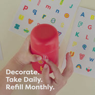 Livraison de suppléments frais avec un approvisionnement de 30 jours, un flacon en verre rechargeable à décorer et des sachets de recharge envoyés chaque mois, selon un calendrier approuvé par les pédiatres.