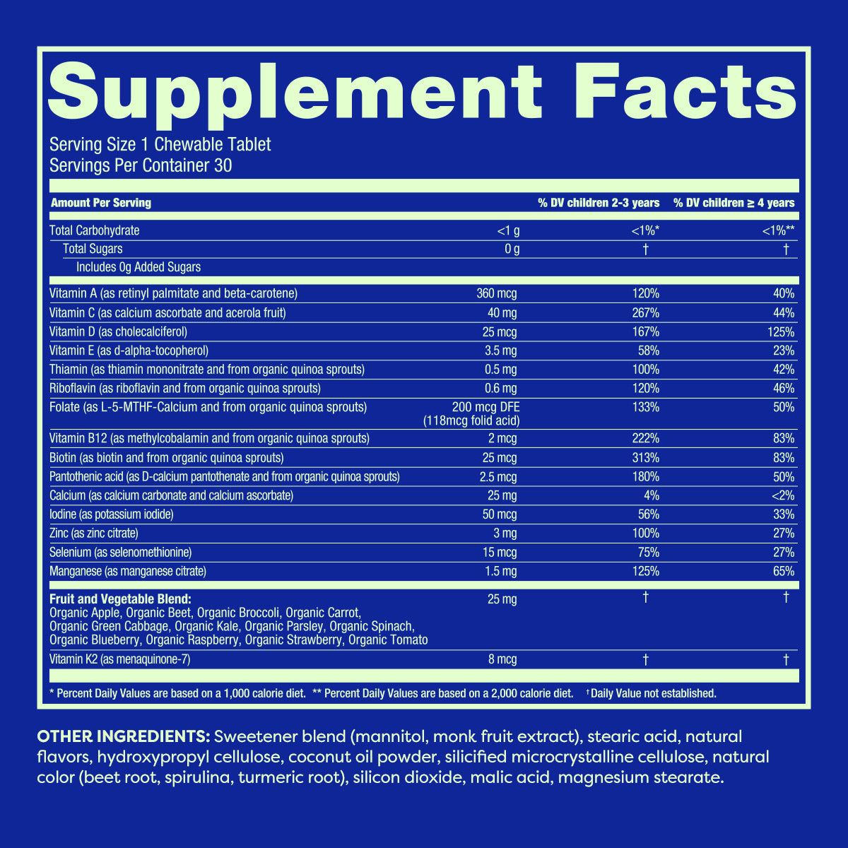 We take 15+ essential vitamins and minerals and a blend of 12 fruits and veggies and turn them into into one daily chewable to help fill in common nutritional gaps.